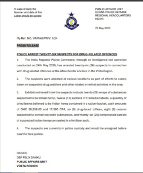 In a crackdown on drug trafficking, the Volta Regional Police Command has arrested 26 individuals linked to drug-related offences near the Aflao border in the Volta Region.