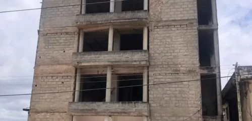 The staircase—part of the yet-to-be-completed community centre—has tyres installed along the sides as a temporary safety feature.