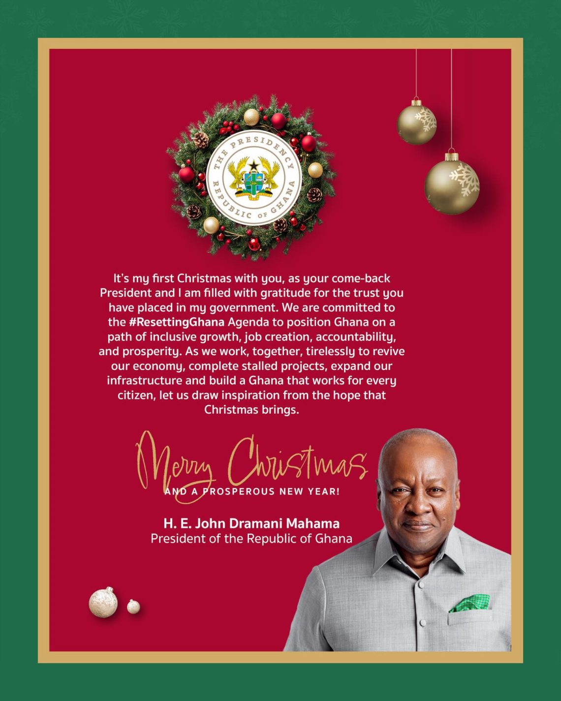 “It’s my first Christmas with you, as your come-back President and I am filled with gratitude for the trust you have placed in my government. We are committed to the #ResettingGhana Agenda to position Ghana on a path of inclusive growth, job creation, accountability, and prosperity.